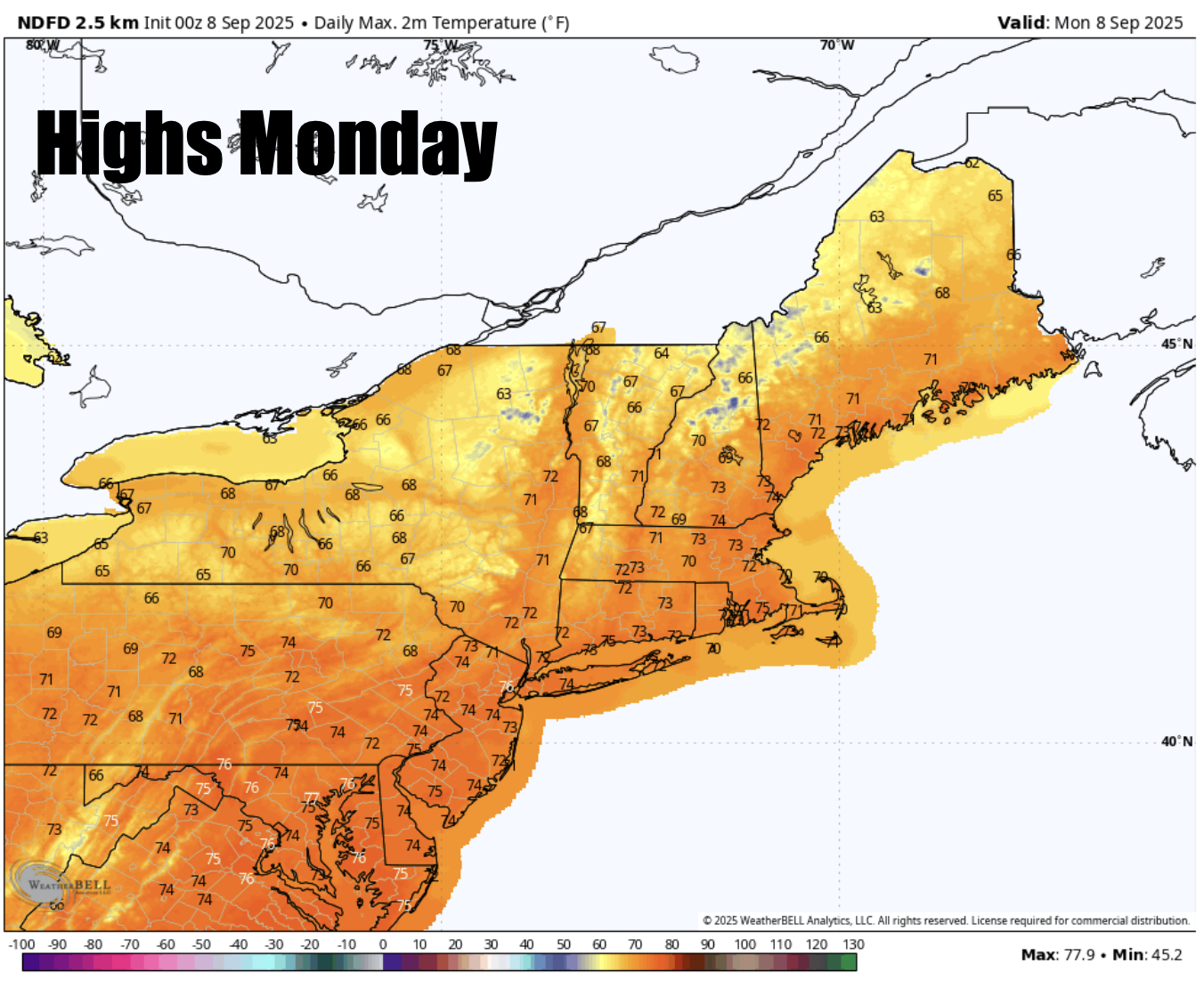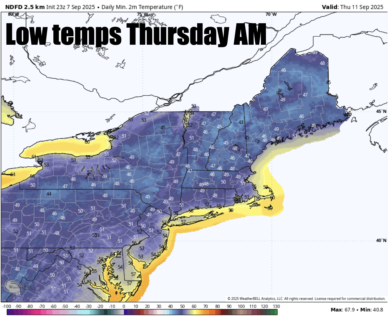 Good Sunday evening. The rain and storms have finally moved out! A confirmed radar indicated tornado occured with yesterday's storms in Holden, MA! It was a wild day with a lot of storms across the region. Fall weather is here to stay this week. Just a stunning week ahead. Highs generally in the low to mid 70s this week with near 80 away from NNE on Thursday. Bright sunshine with a few clouds all week long. Very low chance of a few scattered showers later this week. It is going to get cold at night with lows dropping into the 30s and 40s! Tuesday being the coldest morning with patchy frost expected across NNE! Not much to write about with a nice fall week ahead folks. Get outside and enjoy it!