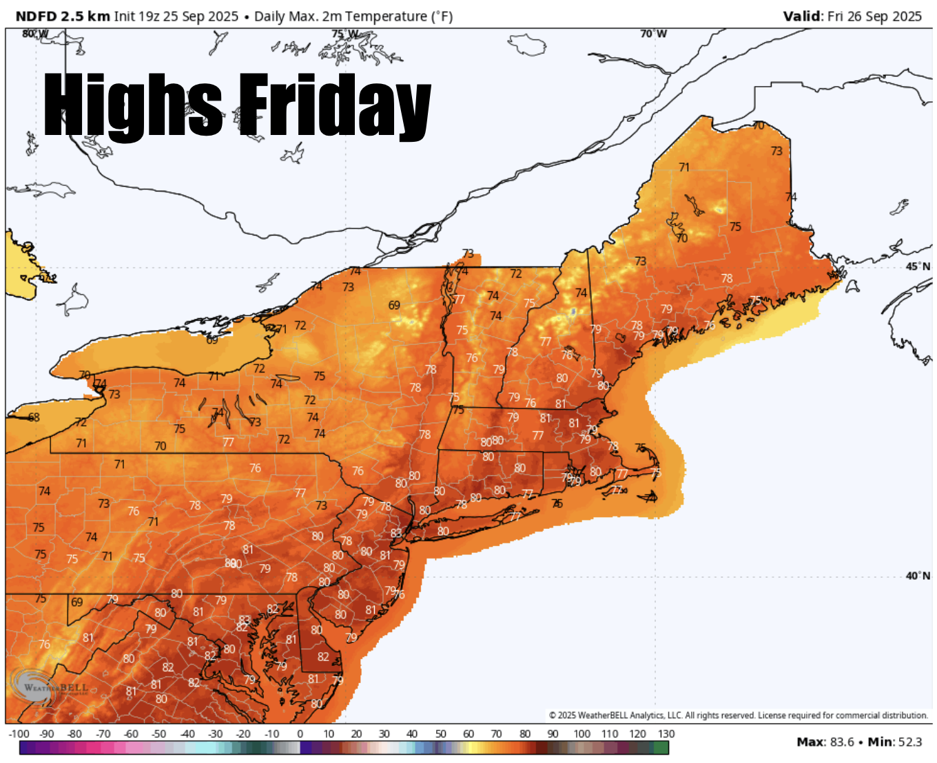 Good Thursday evening. Rain continues to fall out there this evening. We need the rain badly so nothing to complain about! Rain is expected to taper off by early tomorrow morning. Sunshine is expected to quickly break out by Friday morning with a nice day ahead. Highs will be in the  70s and even some low 80s across SNE! Warm for this time of year. A bit humid with dew points in the mid 60s across SNE. Lows in the 50s through the weekend with some upper 40s across NNE. Sunshine continues into Saturday with highs in the 70s. Some upper 60s across far NNE. Upper 70s Sunday across the region. A chance for some scattered light showers across the southcoast of SNE Saturday night into the first half of Sunday but dry otherwise through next week! Warmth continues into Monday with highs near 80 but by mid to late week next week it does look like highs will be stuck in the upper 50s, low 60s! A fall feel just in time for the Topsfield Fair next Friday, October 3rd. Dry pattern setting up after today. Stay tuned for updates and enjoy the end of the week with the sunshine coming back!