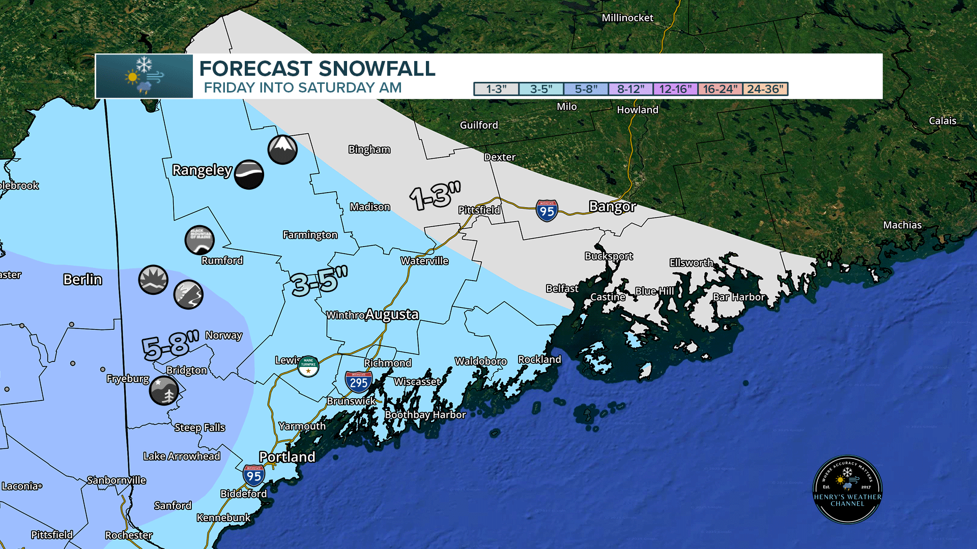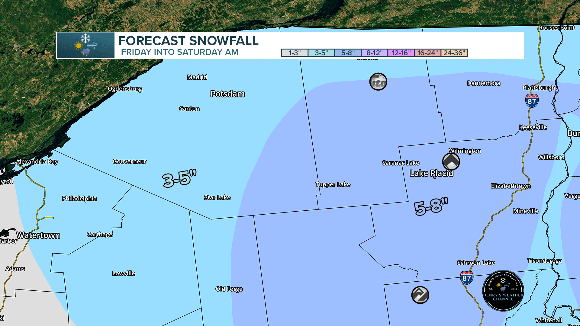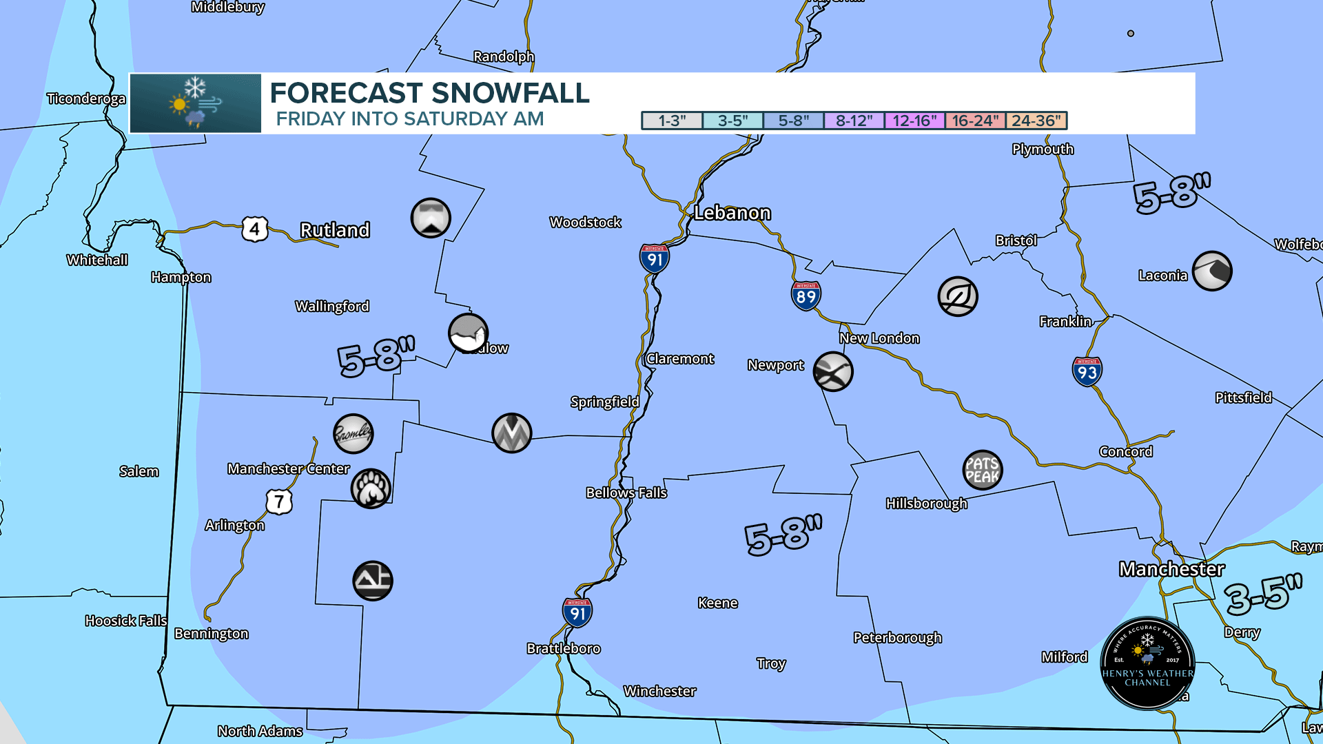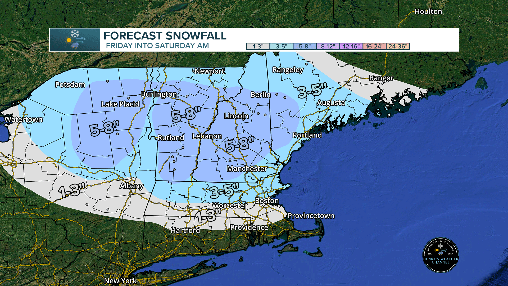 Good Thursday afternoon! A decent snowstorm is ahead for Friday into Saturday morning for much of the region! Snowfall totals are expected to be highest across the Adirondacks into much of Vermont and New Hampshire where 5-8" can be expected! Lower totals across much of Maine and across SNE as mixing will lower totals across SNE. Use the range here! Lower elevations may be closer to 5-6" with the higher elevations having a bit of a better shot at seeing those higher numbers.
