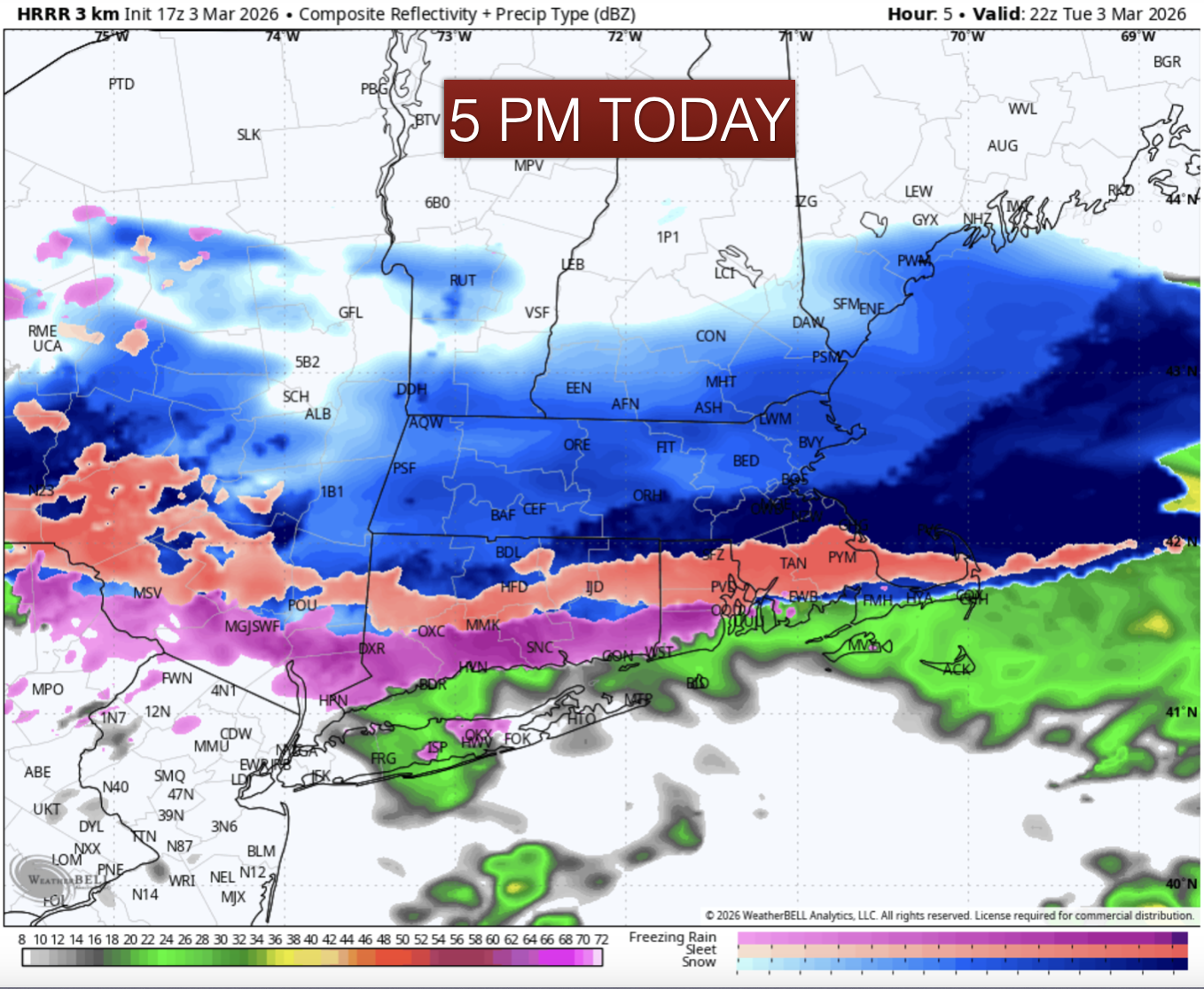 Good afternoon! My concern about freezing rain this evening into tonight is going to verify. A burst of snow right now across SNE will change to freezing rain by 5-7 PM across SNE! Very dangerous travel is expected into tonight with 0.25" of ice on the roads and even a bit higher amounts in spots! DO NOT TRAVEL this evening into tonight if you can stay home! This moves out by 1-3 AM Wednesday with temps in the 40s and 50s across the region. Warmest across SNE Wednesday with a lot of melting. Folks, be careful this evening into tonight! Still expecting 3-5" across parts of VT, NH, into ME (see snowfall maps from yesterday. Stay tuned to our Instagram and Facebook story for the latest updates!