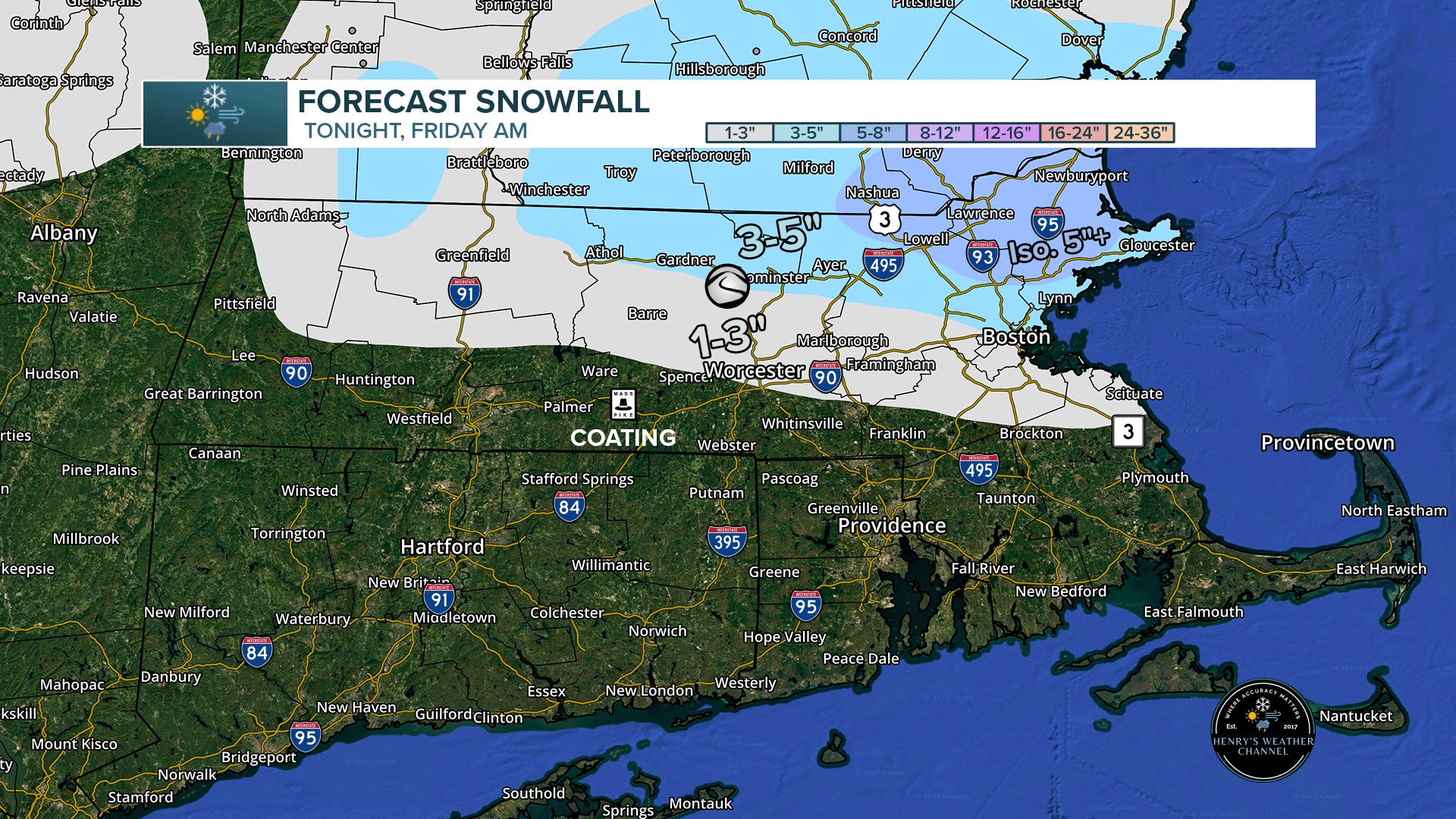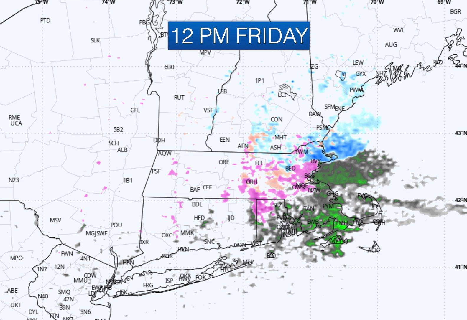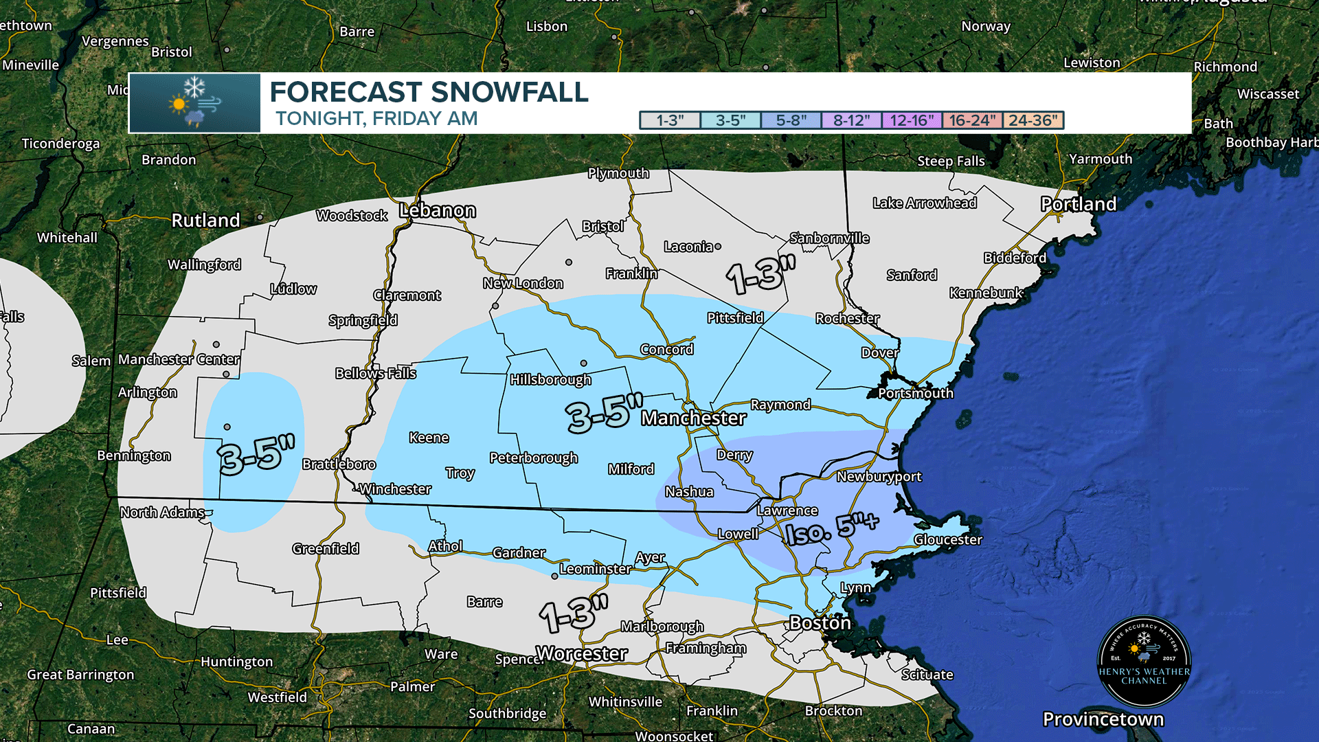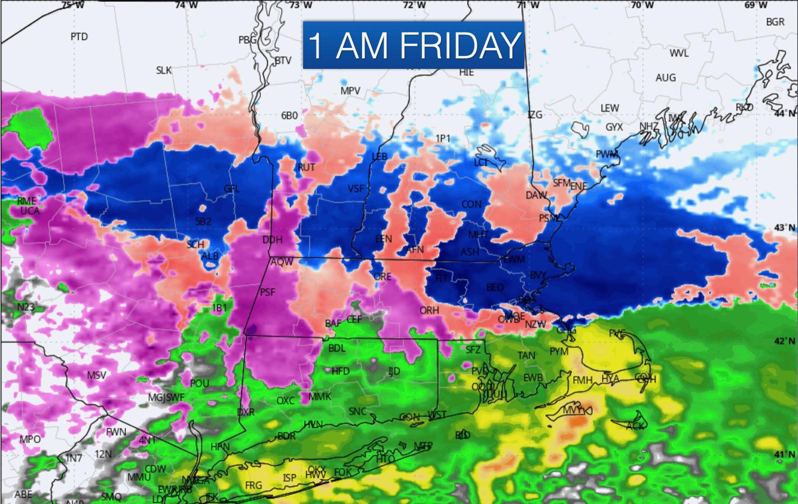 Here's the complicated part! Temps will be around 32-33 degrees with temperatures at 5,000 feet around 32-31! That sleet is going to change to snow later this evening, early FRI AM across northern MA into central New England! The question is how quick do we change over? We are only within a degree here of sleet or snow! Very tricky! I'm thinking that we will see a changeover to snow around midnight tonight with a swath of 3-5" across northern MA into southern areas of New Hampshire to about the Pittsfield area into far southern Maine. One thing that a few models have been showing is some isolated 5"+ amounts across the north shore of Massachusetts up into the Derry area. For that reason, I've added an isolated area of 5"+ but I think the max would be around 6" with this. This is a very difficult forecast as sleet may try to hang around before we flip to some snow! Boston around 3" right now is my best guess. This will be a wet snow across northern MA with temps around 33-32! 20s across NH. VT, ME just north of the Derry area. The Friday AM commute is going to be awful. The bulk of the snow moves out by 9-10 AM but scattered freezing drizzle or snow showers linger across NE MA through the afternoon and even some patchy freezing drizzle across the interior so TAKE IT SLOW and be cautious Friday with temps around 32! Stay tuned to our Instagram and Facebook story for updates!
