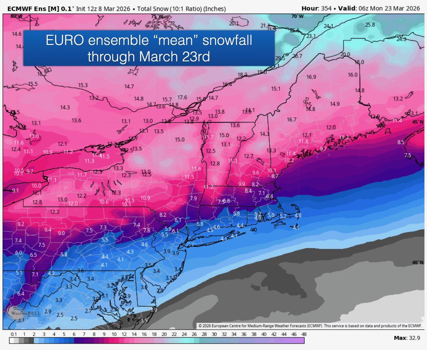 It may be feeling like spring over the next several days but we aren't done with winter just yet! The GFS, EURO and CANADIAN ensembles think we will have more accumulating snow in the forecast through March 23rd. We do look to turn colder mid month and beyond. The Canadian is likely a bit overdone across SNE with ski country seeing the most snow by late month. Let's see if we can get some systems to line up. As always, stay tuned to our Instagram and Facebook at Henry's Weather Channel for the most accurate and frequent weather updates across New England as we track more snow as we head into mid to late March!