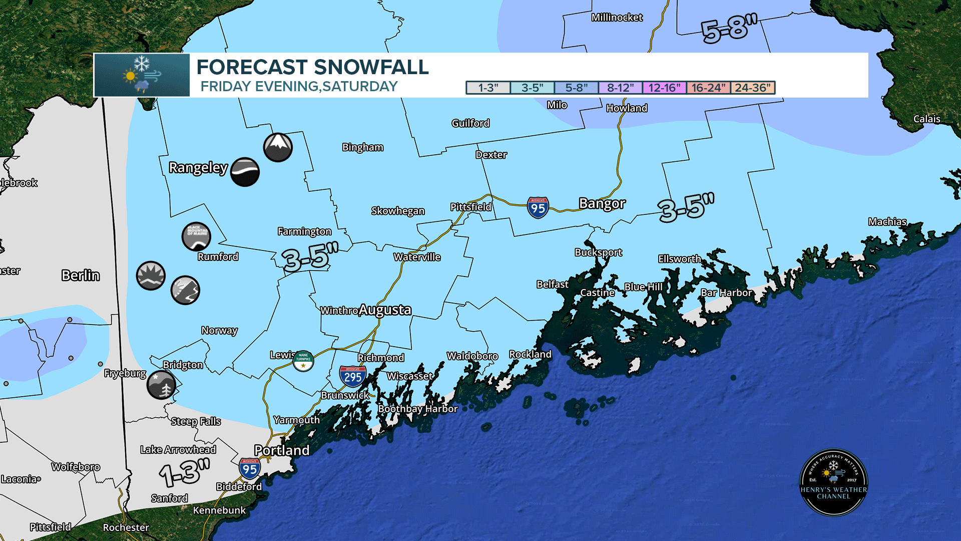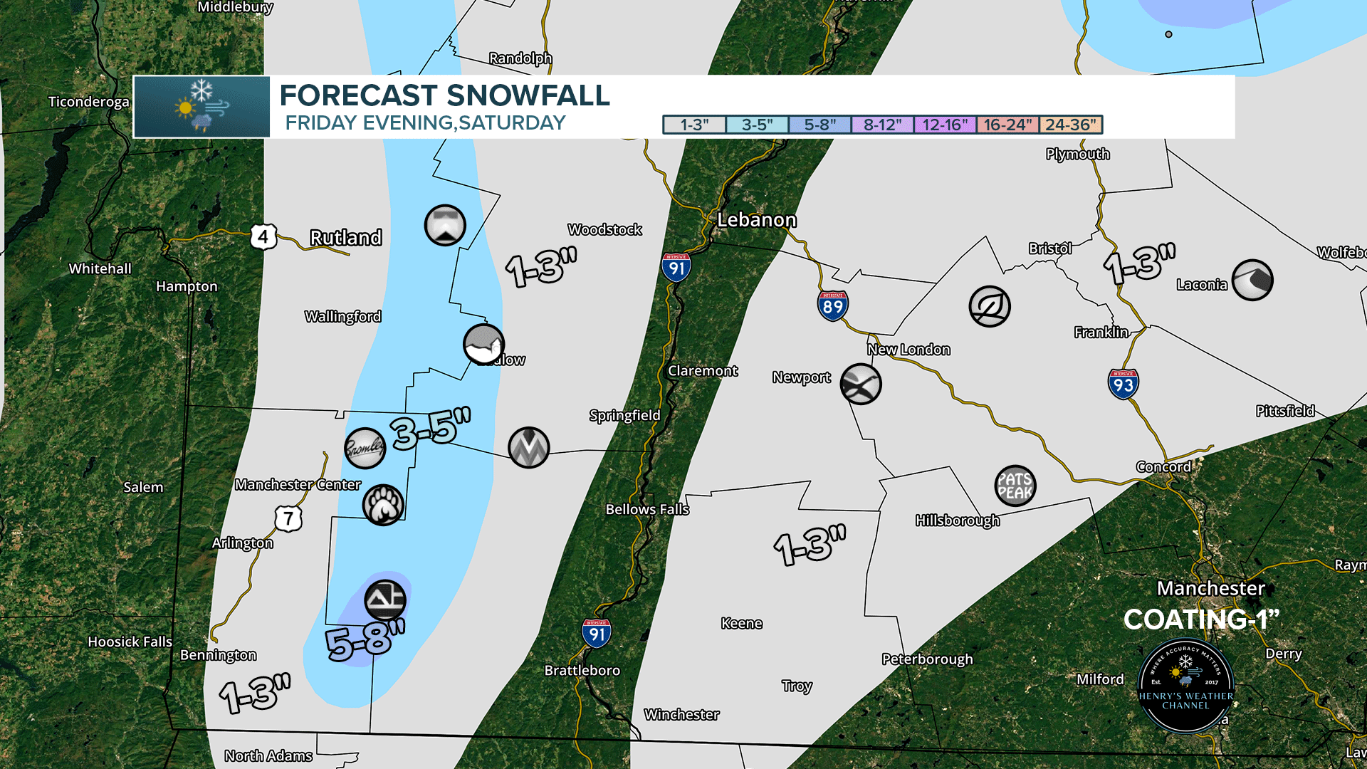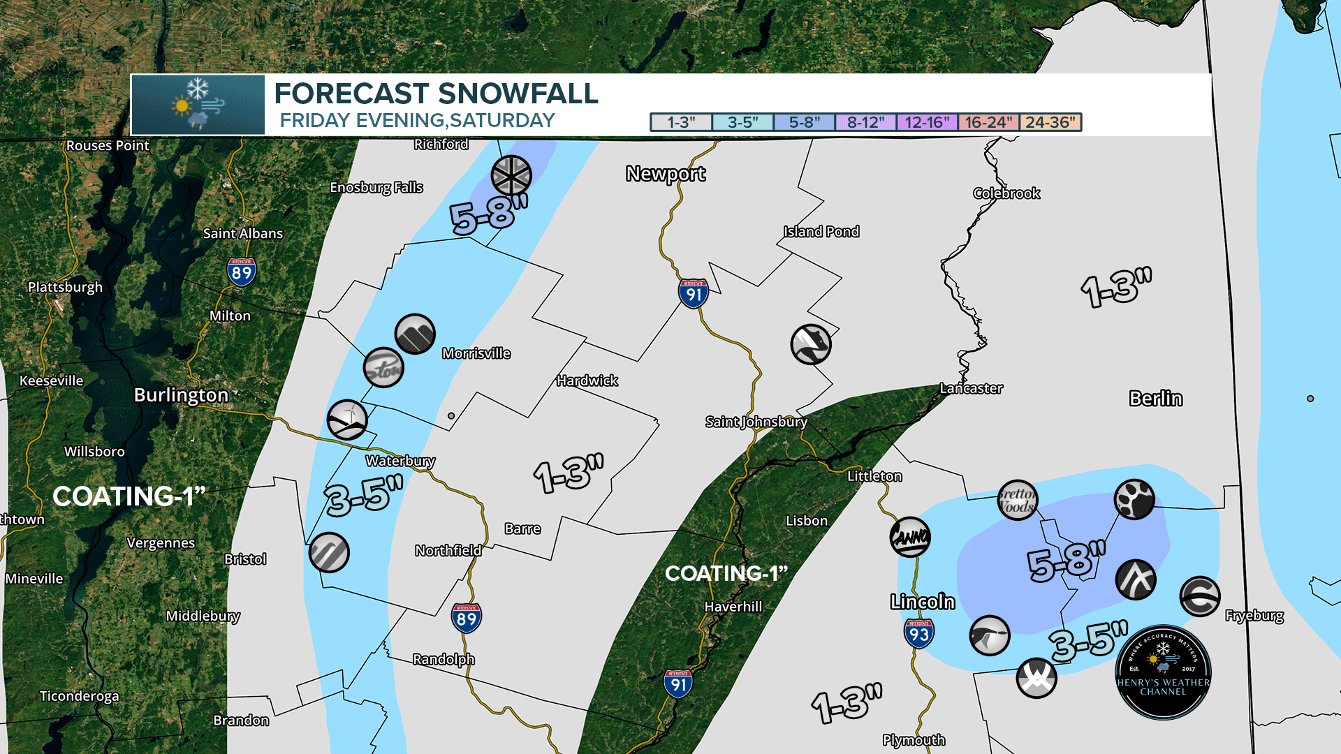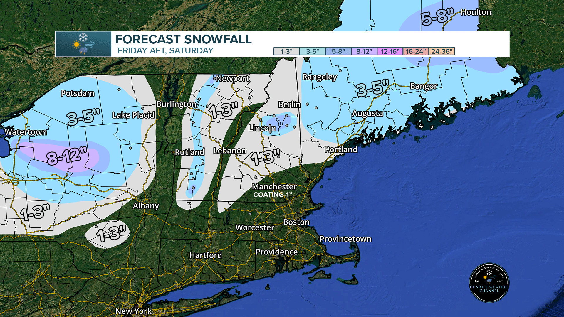 A clipper system is expected to move into New England Friday evening and continue into Saturday AM with upslope continuing into Saturday across the mountains and snow continuing across Maine as a low pressure develops along coastal Maine. I am forecasting 3-5" across the Green Mountains, White Mountains into Maine even near the coast as you head north of Portland! I've added a few pockets of 5-8" across southern VT up towards Jay Peak and the elevations of the white mountains. This will be elevation dependent with a big increase in elevation. 1-3" for the lower elevations. With that low pressure developing across Maine, I wouldn't be shocked to see some more widespread totals of closer to that 5" amount especially across the Mid-Coast into the Down-East area. See the timing on the slides as snow moves in Friday evening into Friday night and continues across the elevations into Maine on Saturday. WINDS will be on the increase Saturday with gusts to 40 MPH especially across southern VT, NH into SNE. Likely lift holds at the ski mountains unfortunately on Saturday. Best chance to see those upper lifts running on Saturday will be across northern New England on Saturday before the wind increases up there for late Saturday aft-eve. Calm winds Sunday. Highs Saturday in the 30s and 20s (coldest across the elevations). Snow will be on the wetter side with a fluffier snow across the highest elevations.