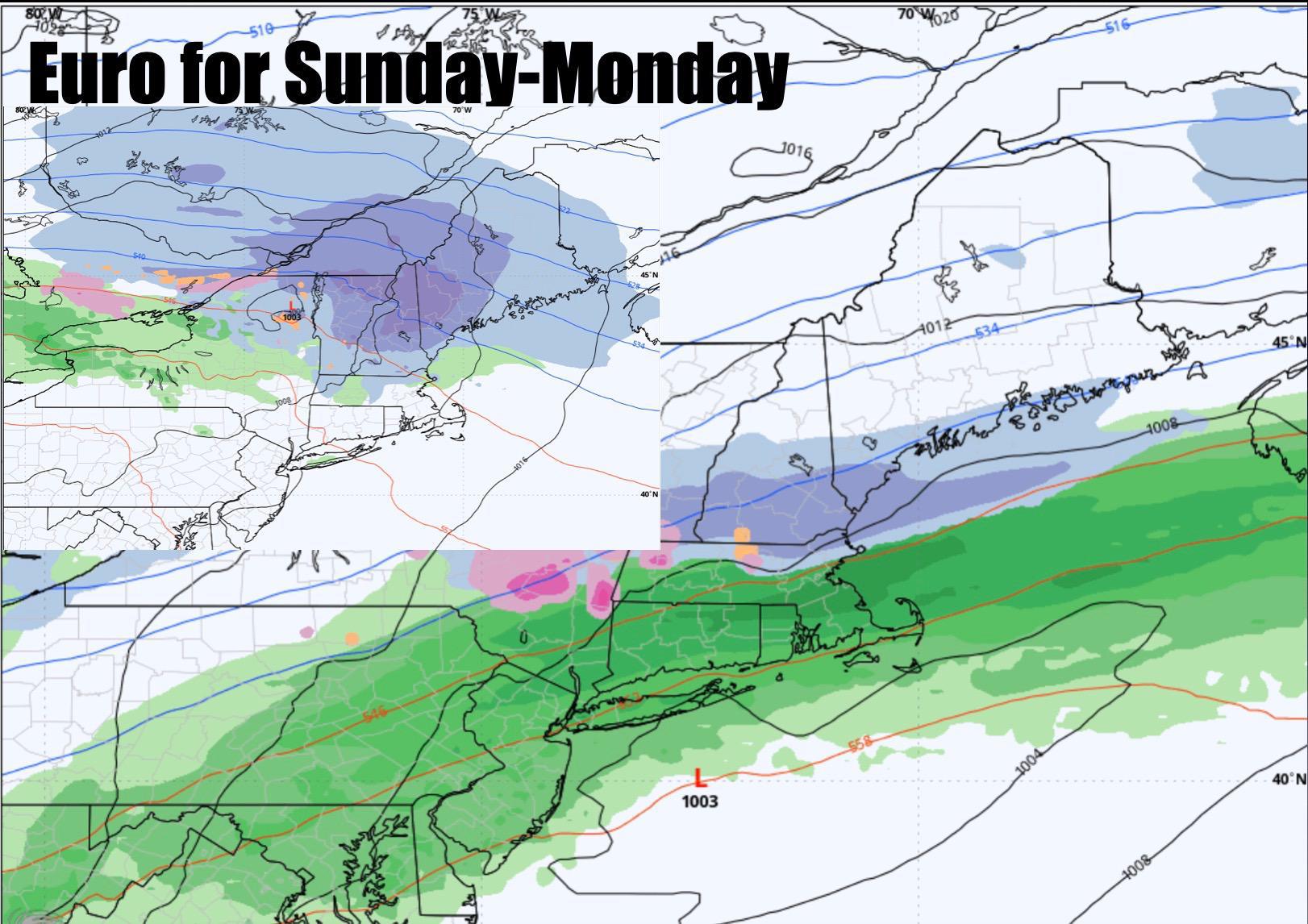 I am watching the potential for a significant winter storm on Sunday-Monday. The GFS goes big with a major snowstorm across central to northern New England. Likely a bit too aggressive but even half of what the GFS is showing would be a big hit. The CANADIAN targets central into northern New England with plowable snow. The EURO is flatter with a burst of snow Sunday then a flatter wave across northern MA into southern NH on Monday.
