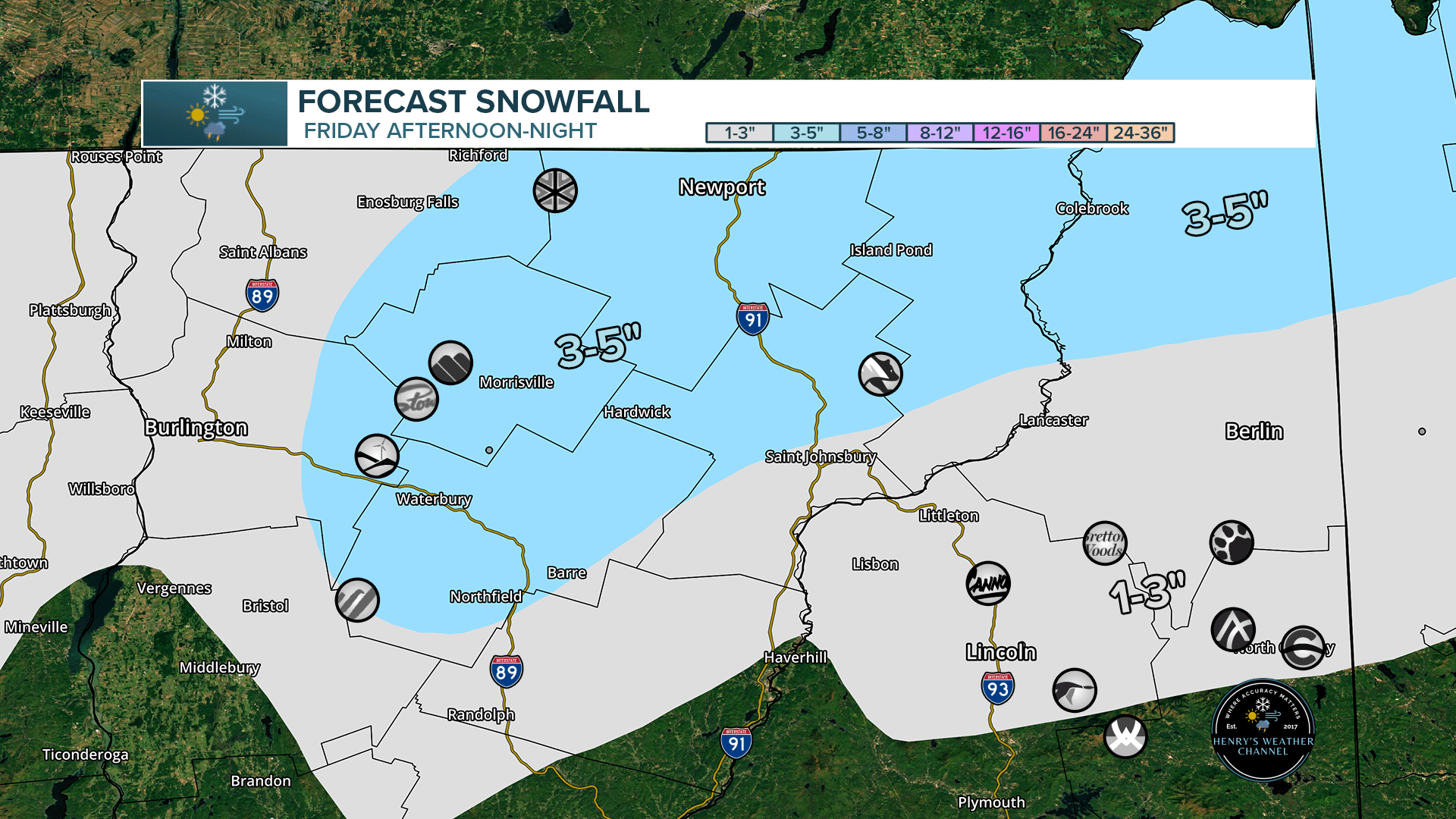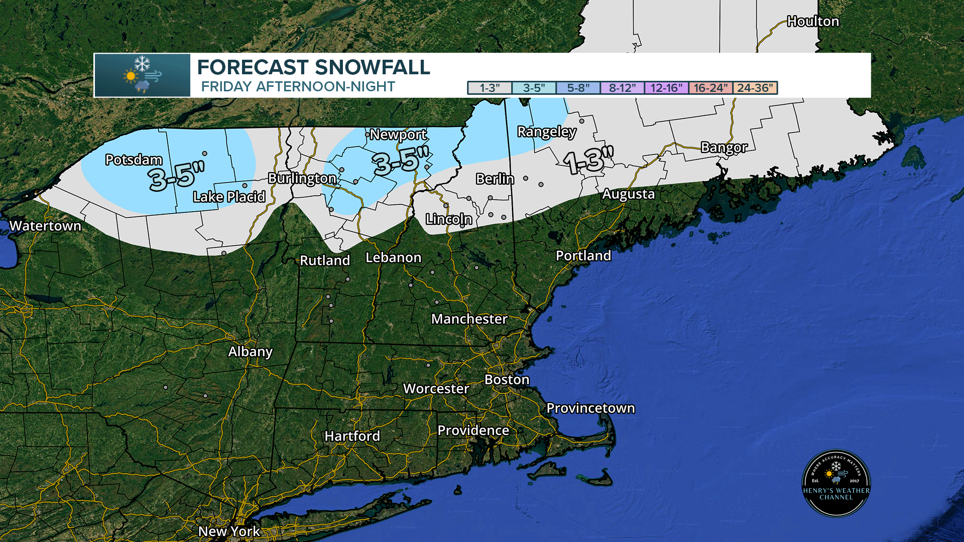 Accumulating snow is on the way across Northern New England Friday afternoon into the late evening. A narrow band of snow moves in by the early afternoon Friday and moves out by late Friday evening-night. 3-5" can be expected across the Adirondacks into the northern greens, northern NH and far NW Maine. 1-3" just south with a very sharp gradient with this! Temps in the low-mid 30s by the afternoon-evening. This will be a heavy wet snow! Some rain showers south of far Northern New England. Calm winds with this across NNE. A bit gusty across SNE with gusts to 30 MPH by Friday evening. This snow is great news for the far NNE ski mountains after the early week rainstorm