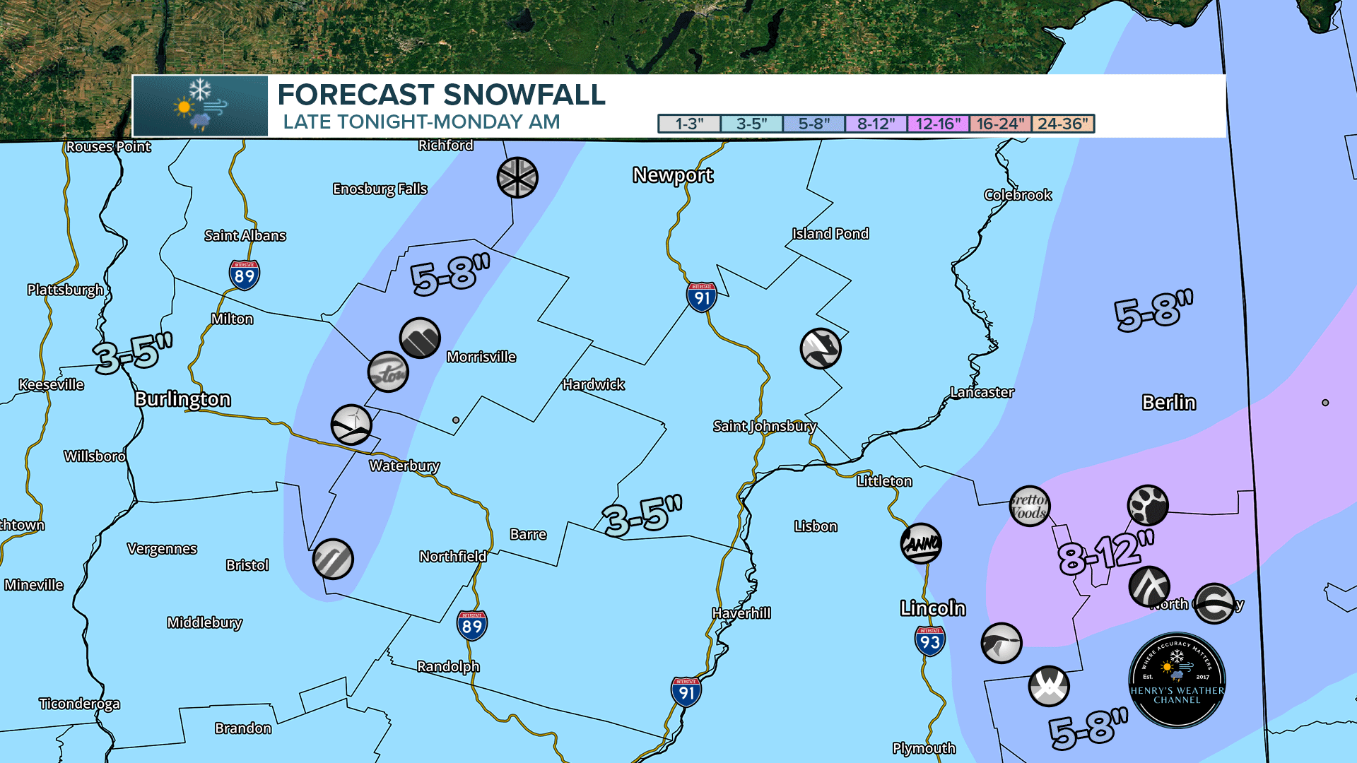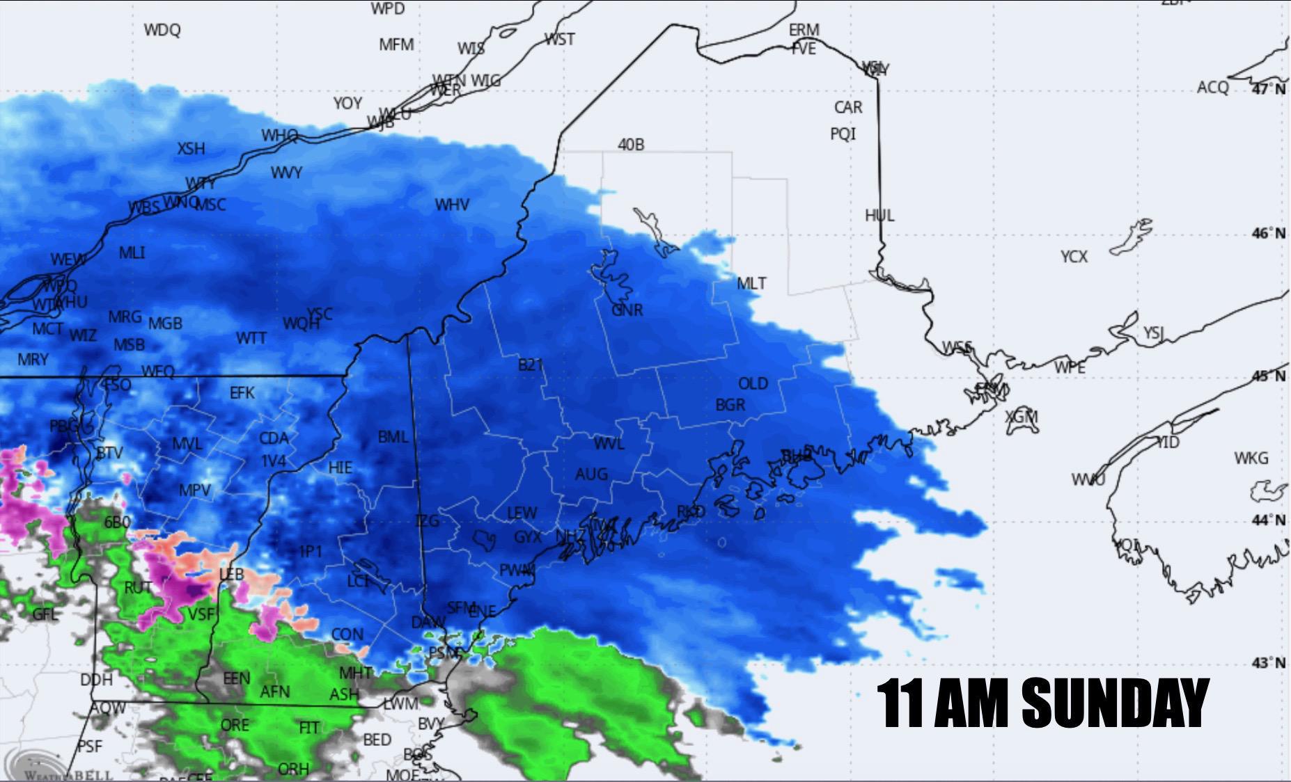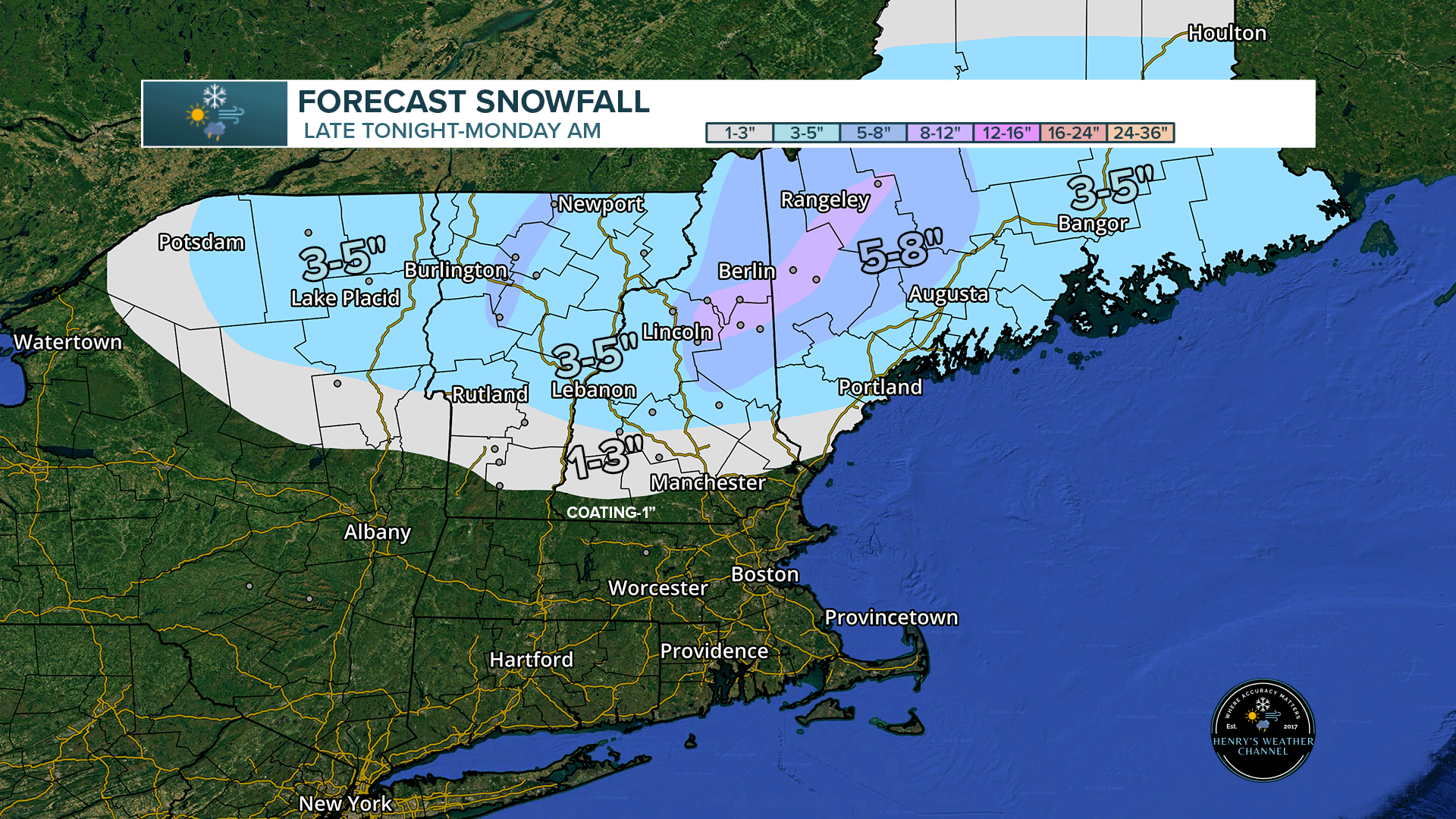 A spring snowstorm is on the way for a good chunk of New England for early Sunday AM through Sunday and going into Monday AM across the mountains. Snow moves in late tonight between midnight and 4 AM Sunday. A burst of 1-3" of snow for southern VT, NH away from far southern areas before a flip to rain showers by midday Sunday. Heavy snow is expected to continue through the afternoon across northern Vermont, especially in the mountains into central New Hampshire and into Maine! Forecast totals of 3-5" before a flip to some showers across the southern areas of that 3-5" in VT, NH with 5-8" expected in the northern green mountains. Summits see those higher totals. 8-12" of snow can be expected across the white mountains especially with elevation for those ski resorts up into the Sunday River, Saddleback, Sugarloaf areas by Sunday night, Monday AM! 3-5" for much of Maine with all snow for around the Portland area or just north points north. Most of this accumulation is done by Sunday evening. Snow showers are expected to continue into Monday AM across the mountains with an additional inch or two. I wouldn't be shocked to see snow showers continue through Monday but only a few more additional inches at most. Watching a narrow band of snow Monday evening, Tuesday AM that may deliver a narrow swath of a few inches so stay tuned to our story for more details on that!