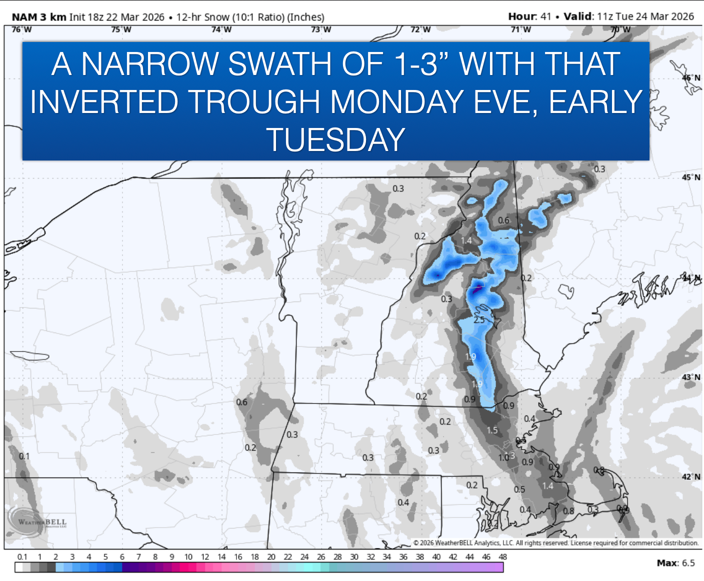 Scattered snow showers are expected to continue through Monday with temps in the low to mid 30s. By the evening we will likely see an inverted trough set up across central NH into NE MA. 1-3" is possible with that. A very narrow band and I'd favor central NH into southern NH to see those totals of more than a coating with that but we'll watch NE MA as well. The exact placement of this may wiggle a bit so stay tuned but it will be a very narrow band of 1-3".