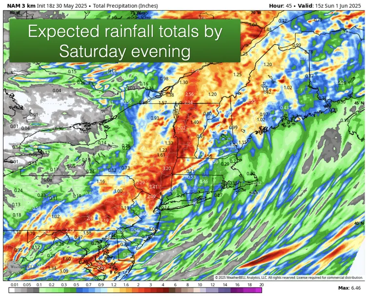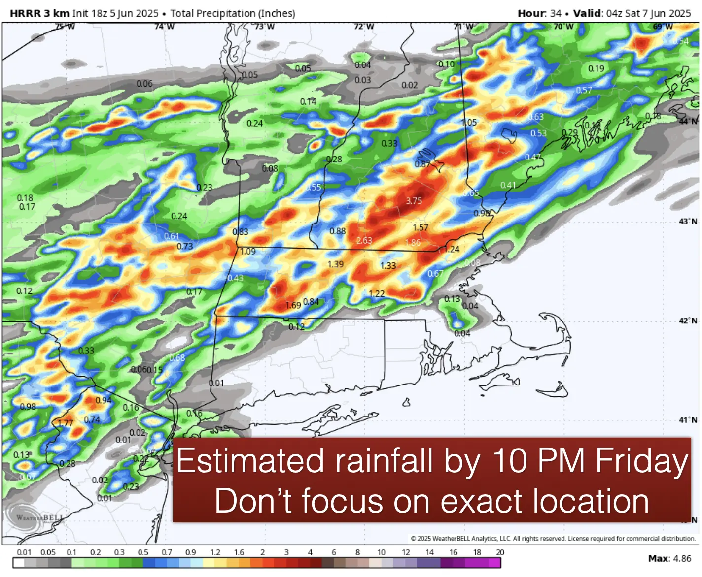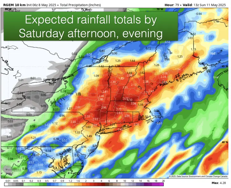 Good evening everyone. We have more heavy rain on the way for tomorrow (Saturday). The 11th consecutive Saturday in a row of rain across much of the region. We are looking at 2" of rain across the interior. Timeline below shows widepread rain increasing late tonight and spreading northward into NNE by Saturday morning. Heavy rain is expected to continue through the entire day across NNE especially VT where a widespread 2-2.5" of rain is expected to fall. An inch to an inch and a half of rain across NH, ME with lighter amounts across eastern SNE as the steady rain is expected to end by 11 AM Saturday with just some scattered showers in the afternoon with some breaks of sunshine possible. Highs in the upper 50s, low 60s across NNE tomorrow and in the 60s across SNE. Rain is expected to come to an end by Sunday with highs in the upper 50s across NNE, 60s, across SNE with sunshine breaking out but clouds may be a bit stubburn in the morning to break across NNE. Just a few scattered showersโ€ฆ