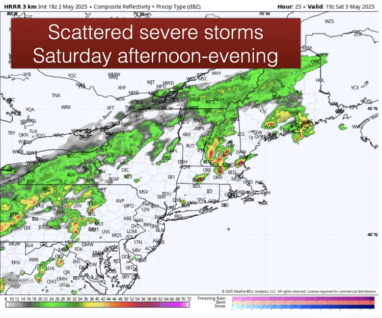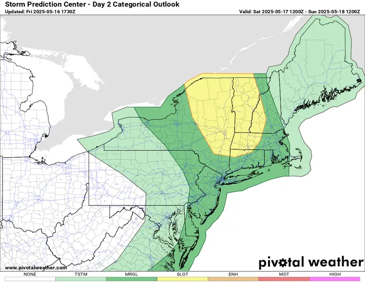 Good evening everyone. The weekend forecast is here! A bit of an unsettled weekend ahead before a chilly week next week! Scattered severe thunderstorms are expected on Saturday across parts of the region. The Storm Prediction Center has placed Upstate NY into through Vermont into Western NH and Western MA into a SLIGHT RISK (Level 2-5) with a 2% tornado risk across that area for tomorrow afternoon, evening! Morning convection may limit this potential but if morning showers, downpours move out by the late morning and sunshine pops out in Western NE then a few cells could very well produce damaging winds and hail with an isolated 2% chance for a tornado. The highest threat in Western New England but some storms may make it to Eastern New England by the late afternoon. Mostly cloudy skies expected for the majority of the day with some breaks of sunshine expected in between those storms which will fuel the atmopshere! Keep a very close eye on the sky especially out that way on Saturday!…